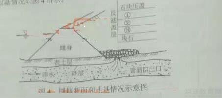 事件2:上游围堰背水侧发生管涌,施工单位在管涌出口处采用反滤层压盖进行处理。反滤盖层材料包括:块石、大石子、小石子、粗砂等,如图4所示。但由于管涌处理不及时,围堰局部坍塌,造成直接经济损失30万元。事故发生后,项目法人根据水利部《关于贯彻质量发展纲要、提升水利工程质量的实施意见》(水安管[2012]581号)规定的“四不放过”原则,组长有关单位制定处理方案,对本工程事故及时进行了处理,并报上级主管部门备案。事故处理后不影响工程正常使用和工程寿命,处理事故延误工期22天。