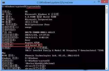 ② 在运行里输入:cmd并回车打开DOS窗口,输入:systeminfo。查看系统类型:X64-based PC